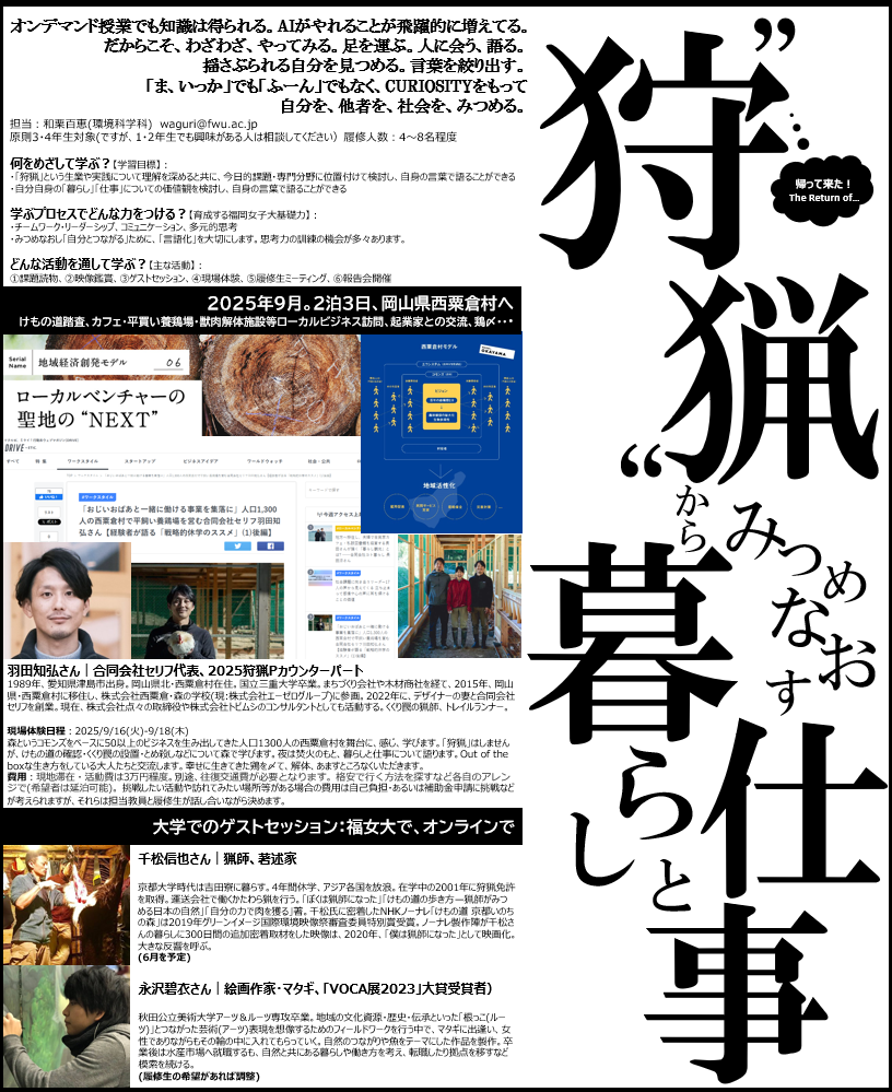 「狩猟」という切り口から、「くらし」や「仕事」を新しい視点で捉えるための、体験から学びを生み出すプログラムです。